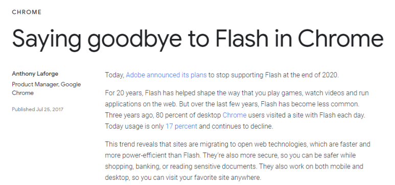 2020년 말까지 어도비 플래시 배포 중단에 따라 구글 크롬도 2020년까지만 플래시 플레이어를 지원할 것이라고 밝혔습니다.