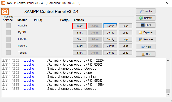 설치가 완료되고 start 버튼을 누르면 아파치가 정상적으로 동작합니다.