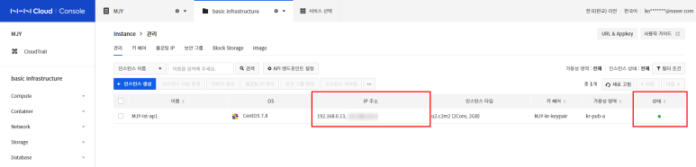 인스턴스 생성이 완료되면 IP 주소에 플로팅 IP가 나타나고 상태가 초록불로 바뀐 걸 볼 수 있습니다.