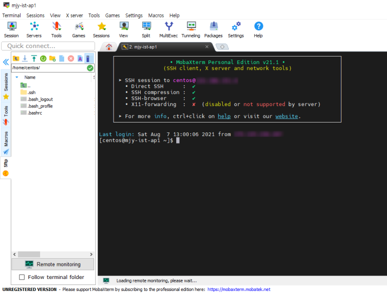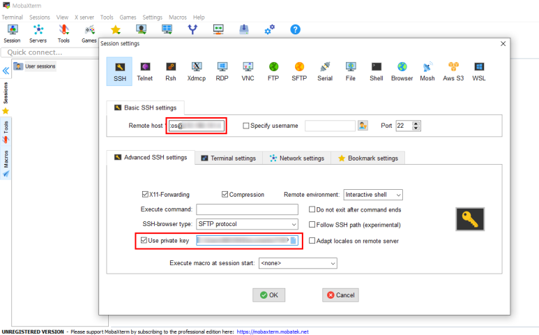 mobaxterm을 실행시켜 remote host를 아래 사진의 접속 정보를 입력합니다.