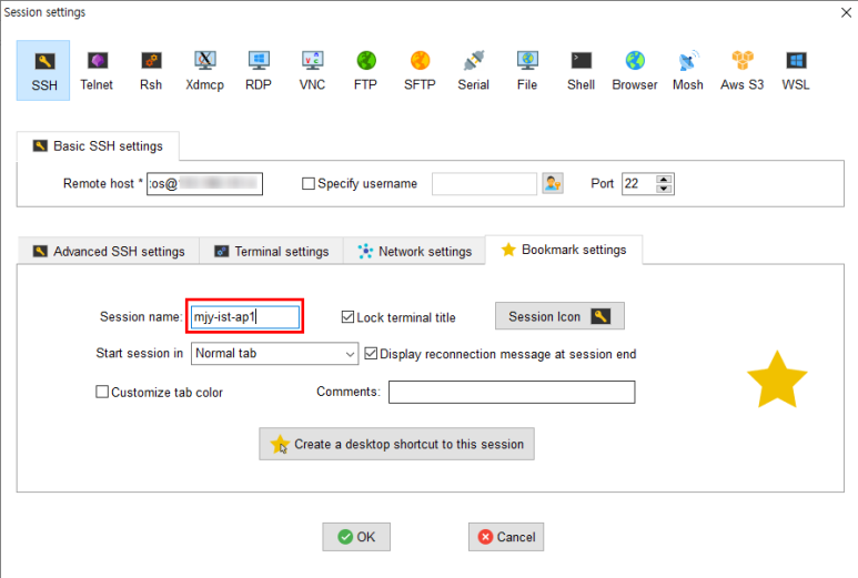 중요한 건 아니지만 mobaxterm에서 세션 정보를 잘 구분할 수 있도록 세션 이름을 변경합니다.