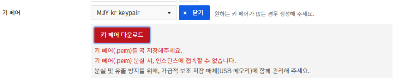 키페어는 저는 먼저 생성을 해놨기 때문에 바로 선택할 수 있었지만 만약 키페어가 없으시다면 생성 버튼을 눌러서 키페어명을 작성하시고 생성하신 다음 아래와 같이 다운로드하시면 됩니다.