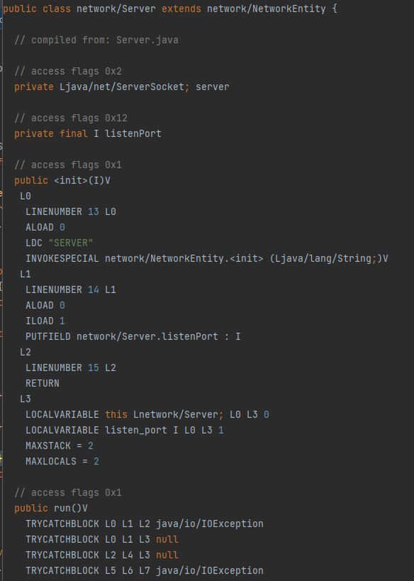 체스 게임의 서버 클래스를 컴파일 하게 되면 오른쪽의 그림과 같이 바이트코드로 변경됩니다.