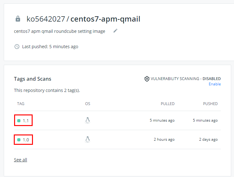 태그 1.0은 apm 구축 1.1은 메일 서버 구축으로 docker 이미지화하였습니다.