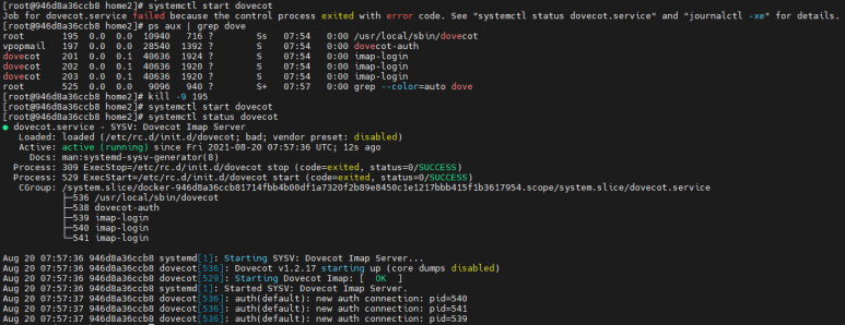 imap 메일 서버인 dovecot을 올리는데 실패했는데요. 관련 프로세스가 떠있는지 확인하고 킬한 뒤에 다시 올려줍니다.