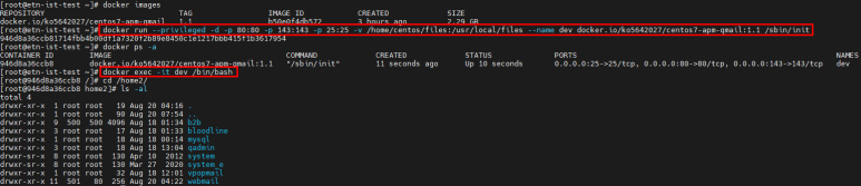 docker run --privileged -d -p 80:80 -p 143:143 -p 25:25 -v /home/centos/files:/usr/local/files --name dev docker.io/ko5642027/centos7-apm-qmail:1.1 /sbin/init