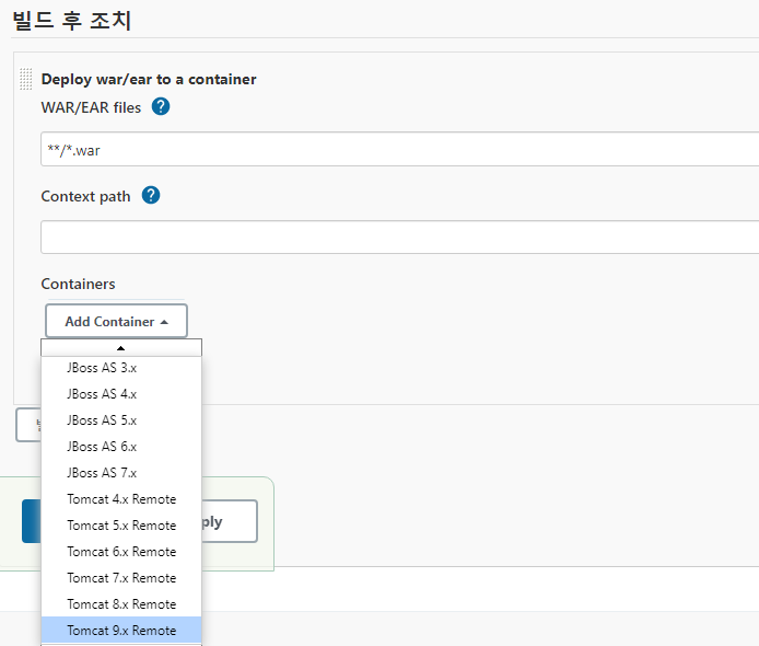 설치가 완료되고 젠킨스가 재시작되면 프로젝트 구성 아래에 빌드 후 조치 영역에서 빌드 후 조치 추가를 하게 되면 Deploy war/ear to a container가 표시됩니다.