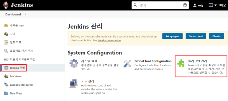 정상적으로 완료되면 Jenkins 메인 페이지가 보이게 됩니다. 저는 maven으로 빌드를 하기 위해서 필요한 부분을 설정하겠습니다. maven 빌드를 하지 않으시면 프로젝트 생성 부분으로 바로 넘어가시면 됩니다.