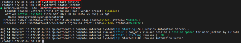 status로 Jenkins가 정상적으로 동작하는지 확인합니다.