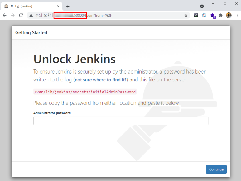 서버의 IP:Jenkins 포트로 Jenkins에 로그인합니다.