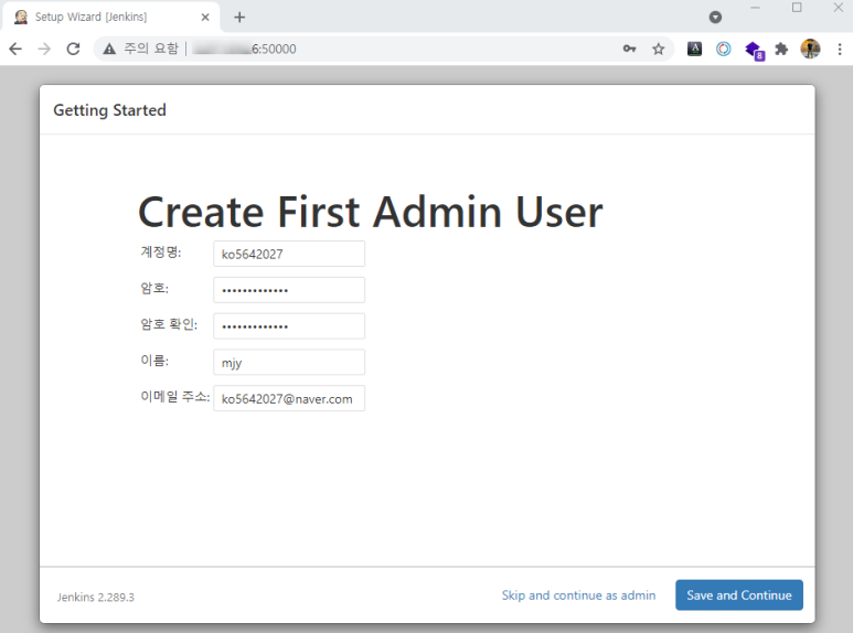 이제부터 Jenkins에 접속할 때마다 로그인이 필요하게 되는데 이때 필요한 로그인 정보를 입력합니다.